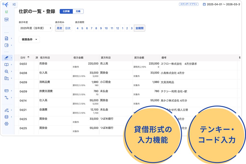 「freeeは使いづらい」という士業の皆さまの声に真摯に向き合い、元帳・出納帳形式の画面に「貸借形式の入力機能」を搭載しました。