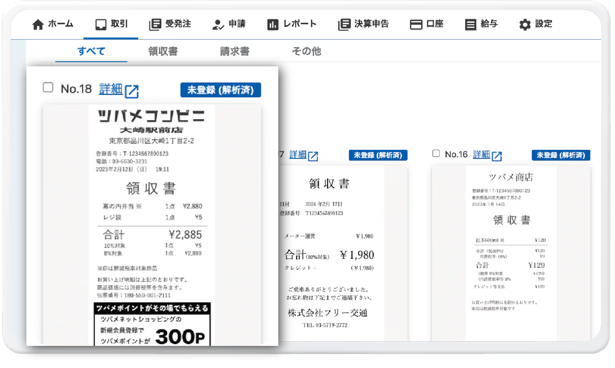 レシートや請求書をAI-OCRが読み取り、自動でデータ化・自動で入力。手入力の手間とミスを解消します。