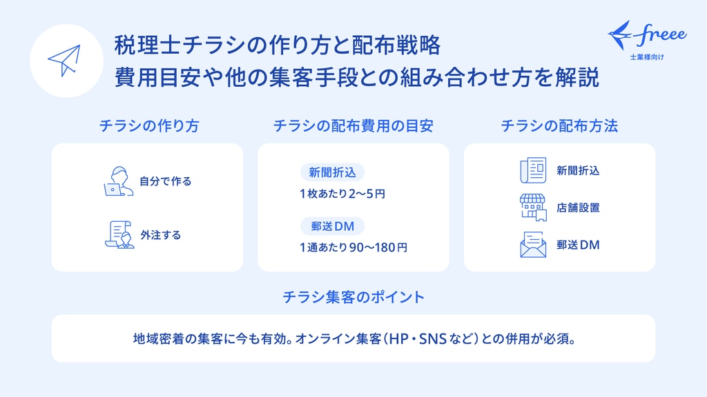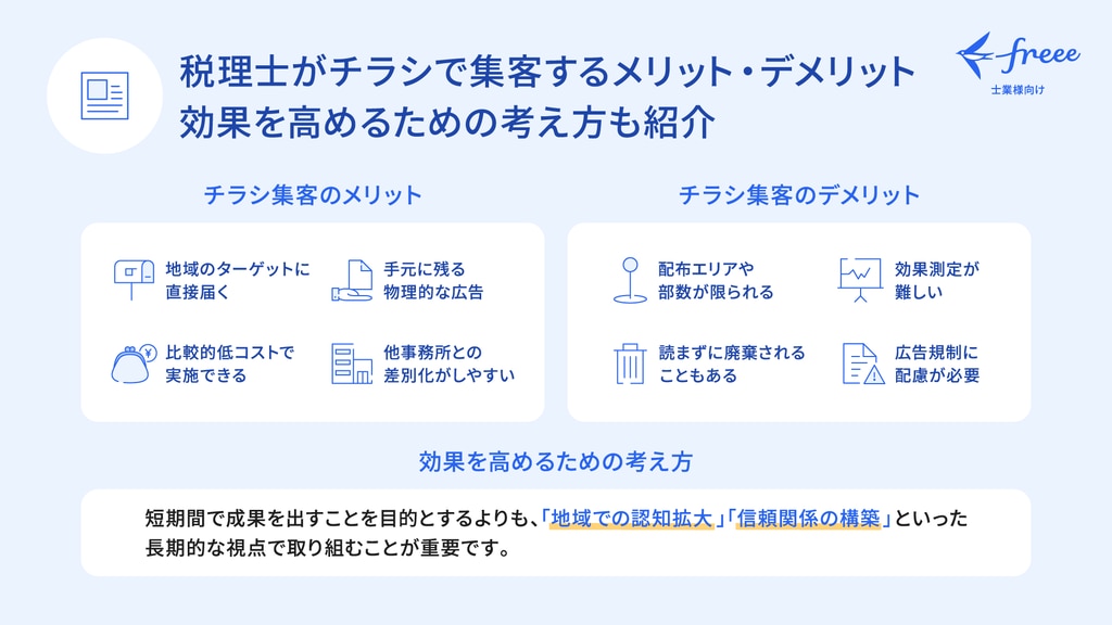 税理士がチラシ集客をするメリット・デメリット、効果を高めるための考え方、注意点を解説。地域密着型ビジネスで有効なチラシ活用のポイントを紹介します。