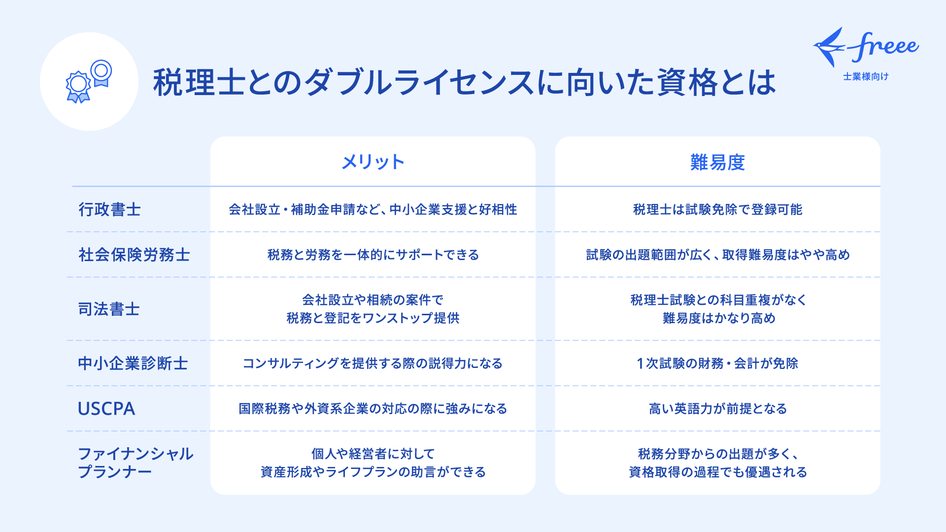 資格名 | 主なメリット | 難易度 | 免除科目 | 税理士との相性 |