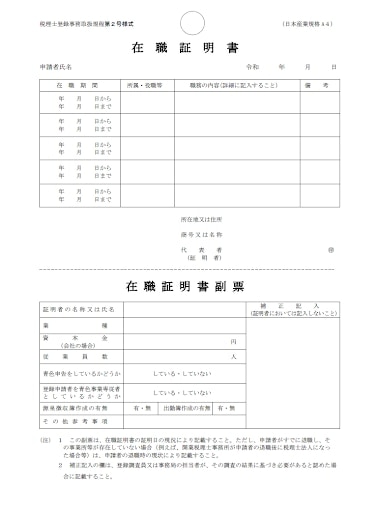 実務経験が2年以上あることを、勤務先の代表が証明する書類です。税理士試験で5科目合格したり、一部を大学院で科目免除となったりした人全員に共通して必要となります。