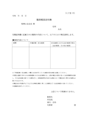 一般企業の経理などで働いた場合、職務概要説明書が必要です。一般企業だと、税務や会計に関係のない業務に従事することがあります。その程度などを踏まえ、実際に実務経験が2年以上あるかどうかを見るために必要です。この他、勤務先の組織図も求められます。