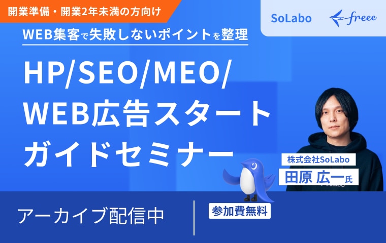 | セミナー名 | 【アーカイブ配信】HP/SEO/MEO/WEB広告のスタートガイドセミナー |